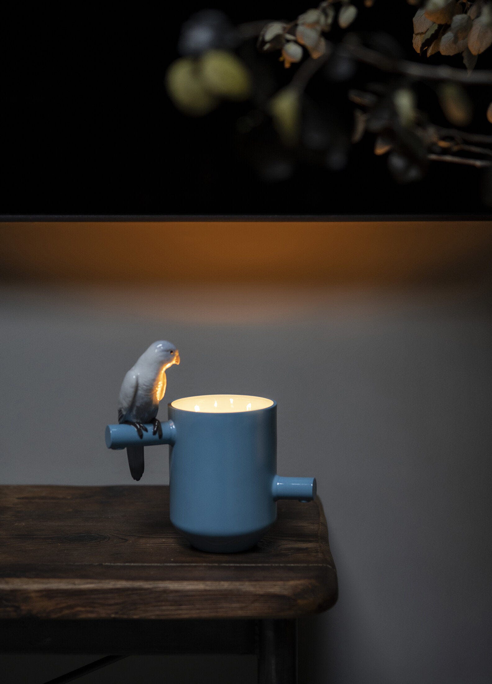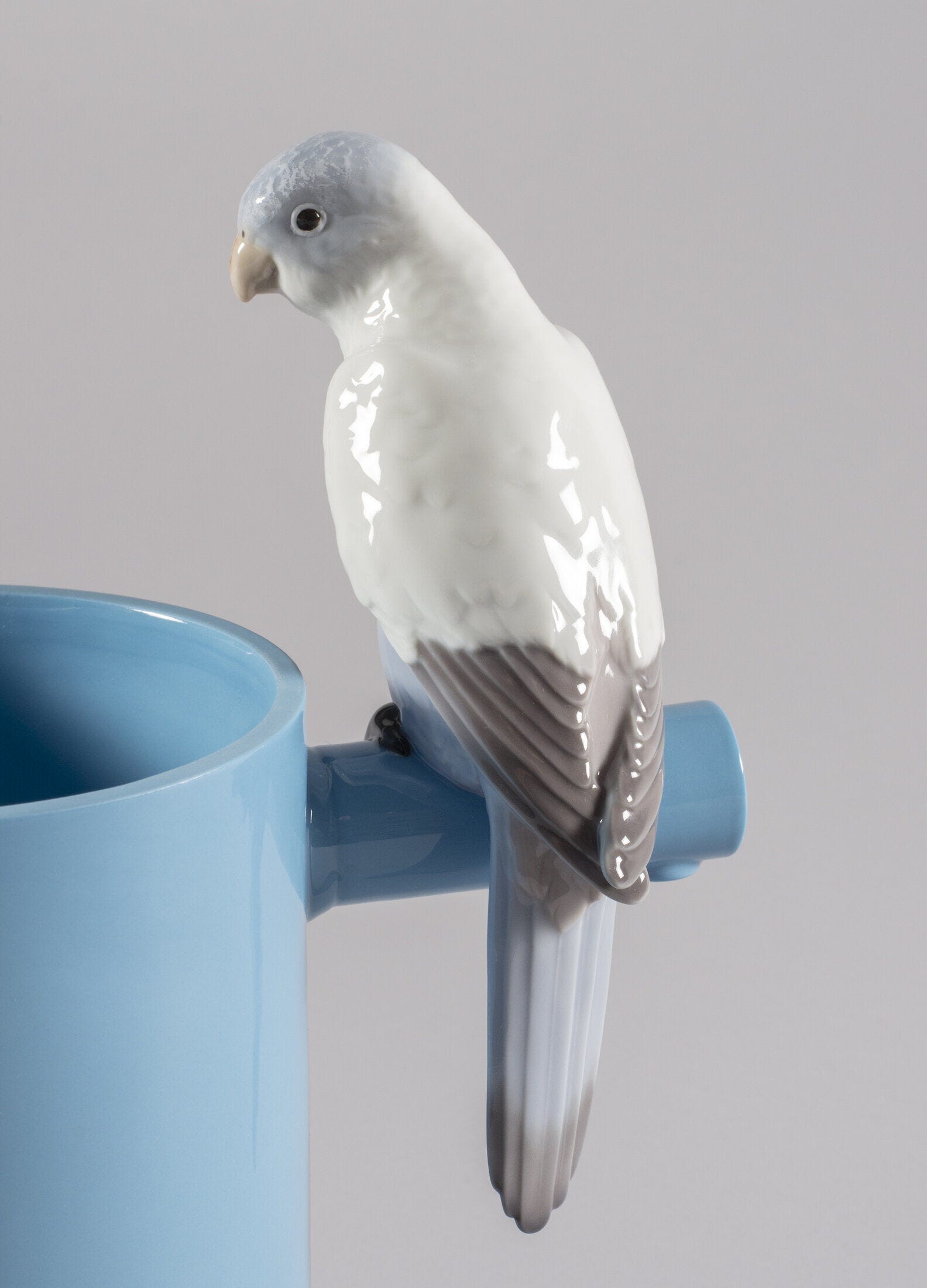 This original porcelain candleholder stands out for its fun, surprising design, based on the contrast between the modern, functional forms of the holder and the realistic modeling of the meticulously decorated cute parrot that rests on it.