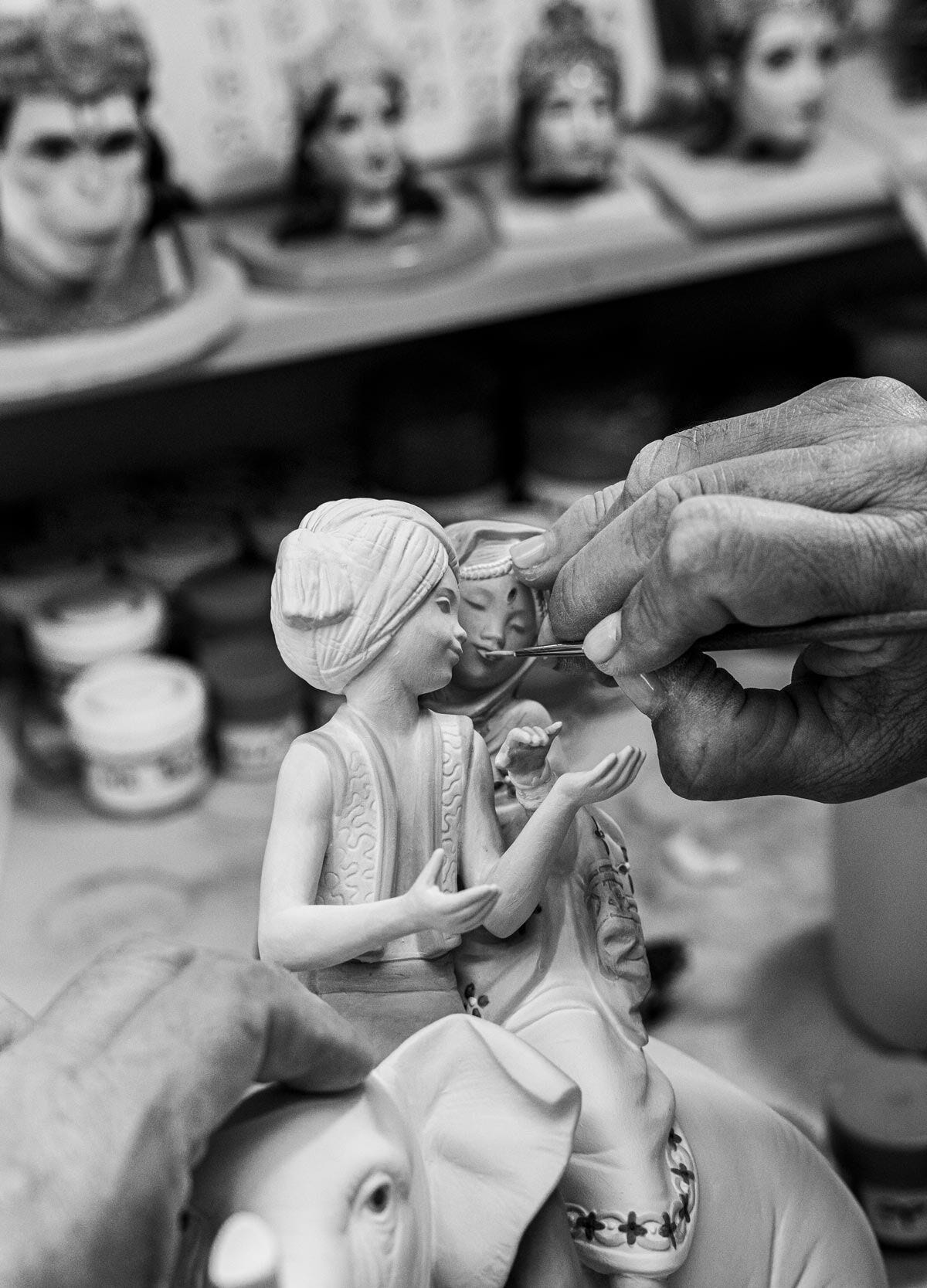 The noble and mighty elephant not only shares with man the work of the farm or hunting. While still a calf, he also enjoys children´s games and pranks. In this gloss finish porcelain piece, he shares his protagonism with a charming pair dressed in typical Indian clothing.