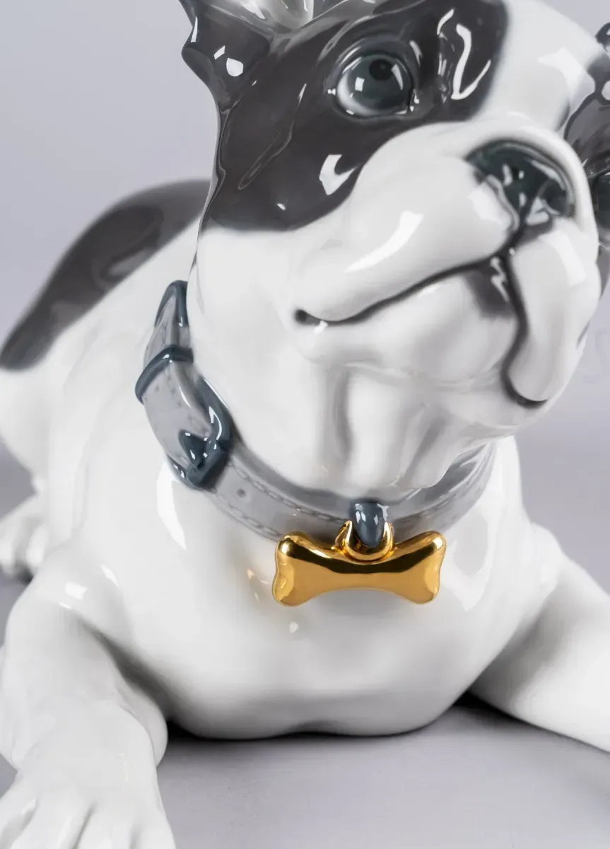 Finished in a combination of gloss and matt, this piece is decorated with soft pastel tones, except for the intense black of the black spots of the bulldog that gives it contrast and the touch of golden brightness of the ornament worn on the necklace. Perfect for giving, collecting or decorating, made in Spain by Lladró’s expert artisans.