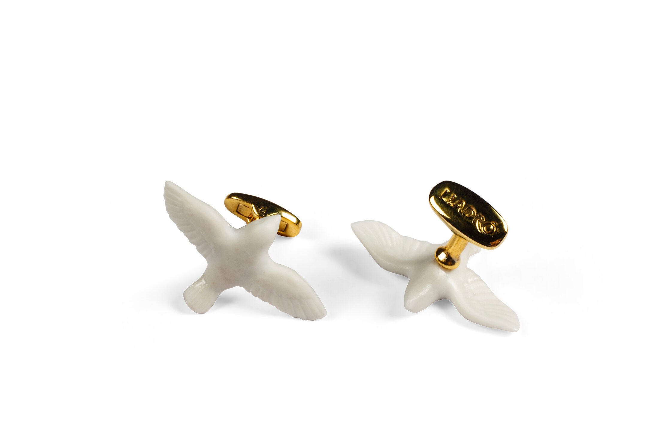 Cufflinks from the Magic Forest collection, Lladró's first foray into the world of jewelry in collaboration with the German designer Bodo Sperlein. Small handmade porcelain birds perched on branches of sterling silver with a gold finish. Pieces of delicate beauty, very luminous and festive, in which the main focus is on Lladró's modelling ability. A small handmade work of art in Valencia, Spain.