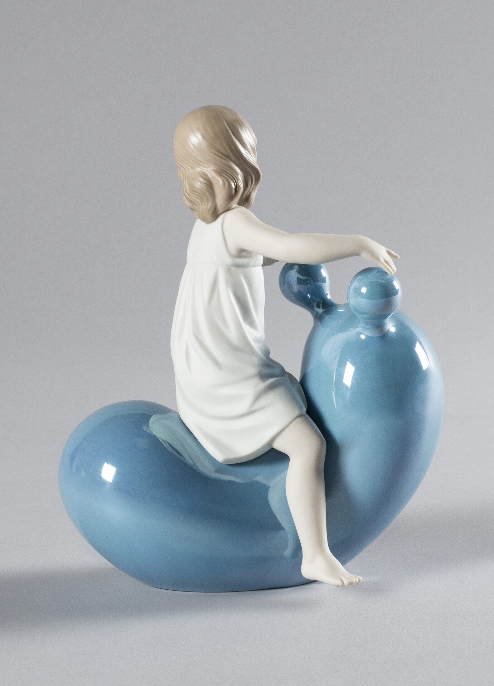 The sweetness and charm of the little girl, represented in the purest Lladró style, are enhanced by the forms and the intense color of the balloon. A piece of matte porcelain, finished in soft pastel tones with metallic iridescent blue, ideal para a gift, for collectors and for decorating interiors. Handcrafted in Spain.