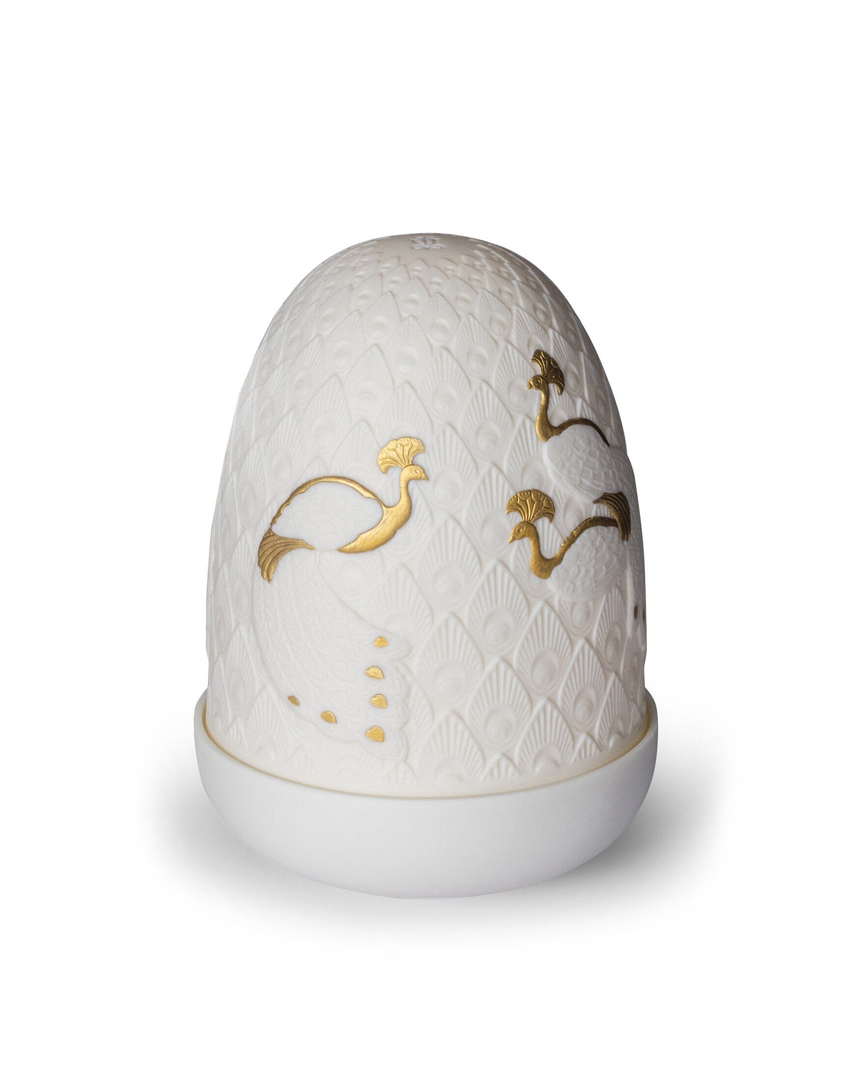 With a matte porcelain finish and ornate decoration with golden luster, when these lamps made in translucent porcelain are lit, you can see the rich ornamentation of the patterns etched on their surface. The lamp includes a LED module with a touch dimmer switch to control the level of light. Handcrafted in Spain.