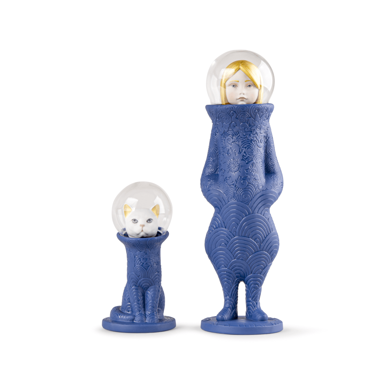 Los cascos que protegen sus cabezas son de cristal soplado, elaborados artesanalmente por una empresa local en Valencia, España. El rostro de la niña y del gato están pintados con gran detalle y con toques de lustre metalizado que aportan un brillo especial.