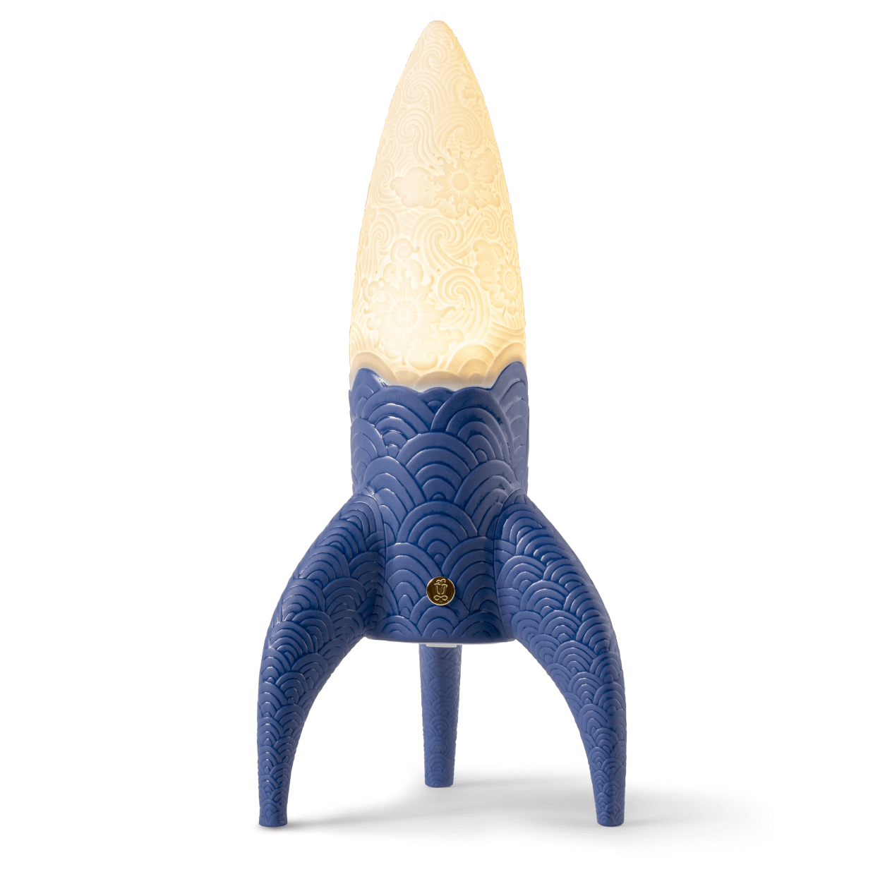 La escena se completa con una lámpara inalámbrica en forma de cohete, también grabada a mano. Su luz suave transforma cualquier rincón en un lugar perfecto donde soñar con nuevos comienzos.