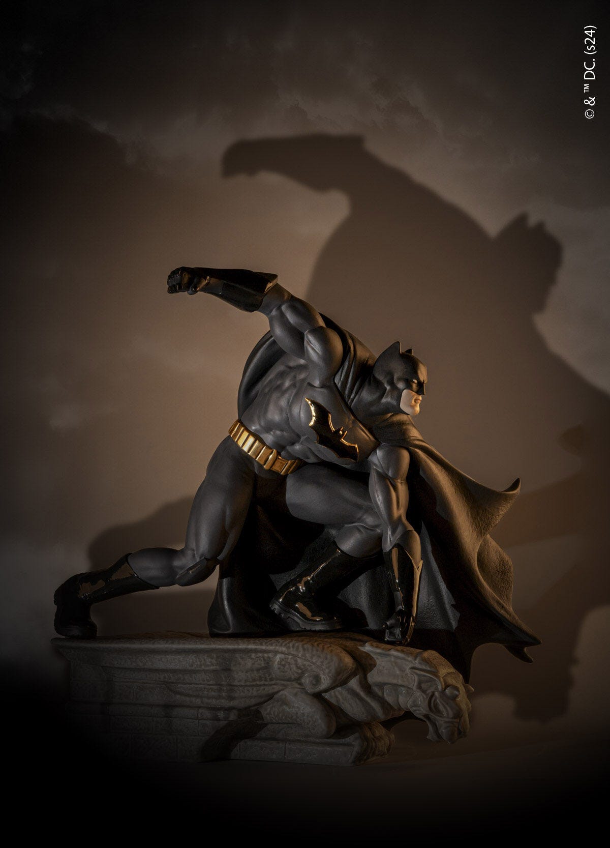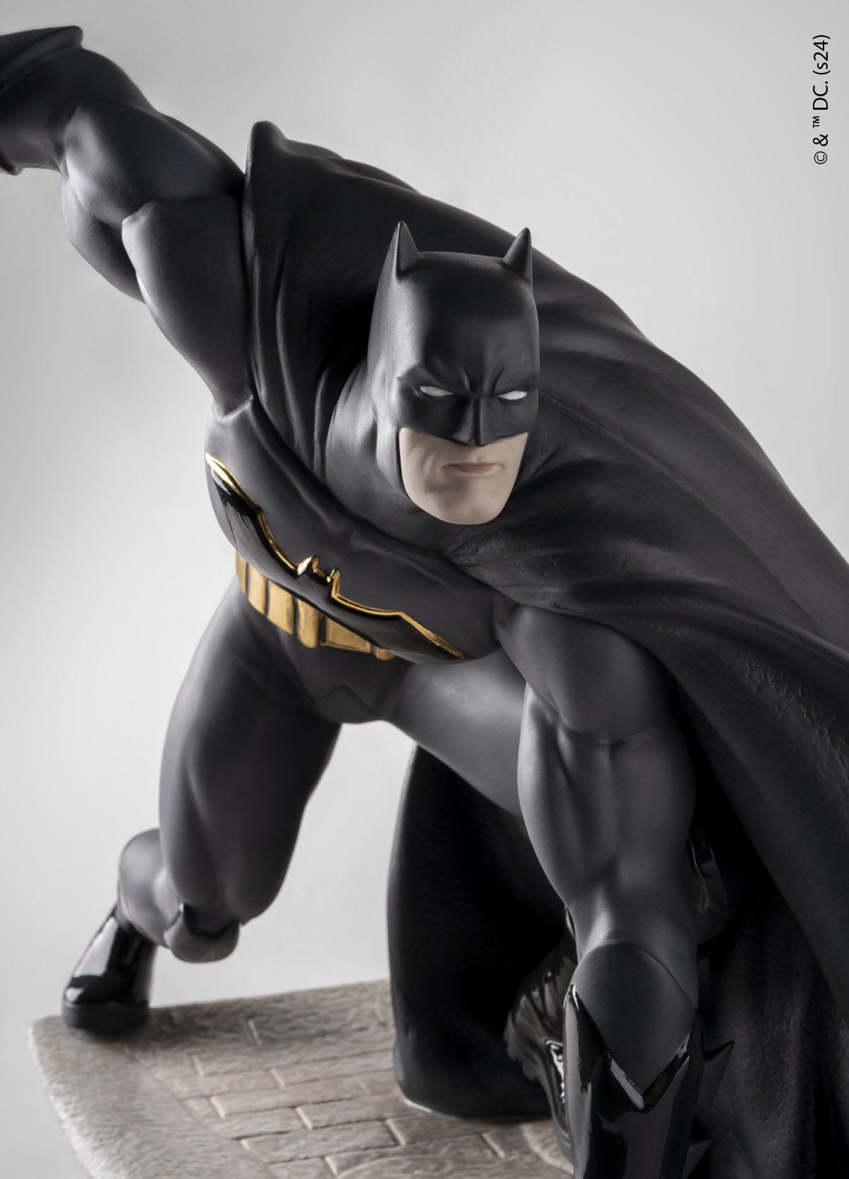 Batman es, junto a Superman, el héroe contemporáneo por excelencia. Desde los cómics hasta el cine, pasando por la televisión, sus aventuras han llenado las fantasías de muchas generaciones de fans en todo el mundo. En esta dinámica y espectacular recreación se ha elegido la porcelana mate, perfecta para expresar todos los detalles anatómicos del personaje y para destacar sobre ella la decoración combinada de negros brillo y mate, con toques muy elegidos de lustre dorado. El caballero oscuro, lleva su característico uniforme, la capa al viento perfectamente reproducida, y está dispuesto a lanzarse a defender la justicia desde una de las icónicas gárgolas de los tejados de Gotham City