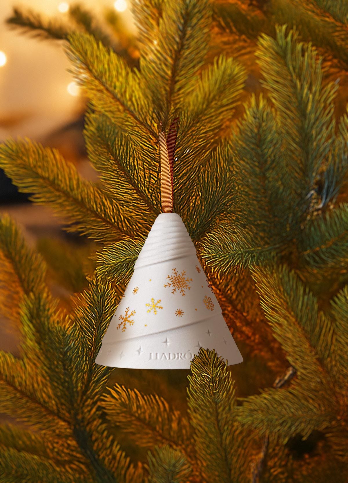 Happy Holidays es un ornamento de porcelana blanca mate, hecho y decorado a mano. Su diseño cónico combina copos de nieve pintados con lustre dorado, grabados de estrellas, y un patrón de líneas en relieve. Una propuesta que transmite la magia de los paisajes invernales y el brillo acogedor de las luces festivas.