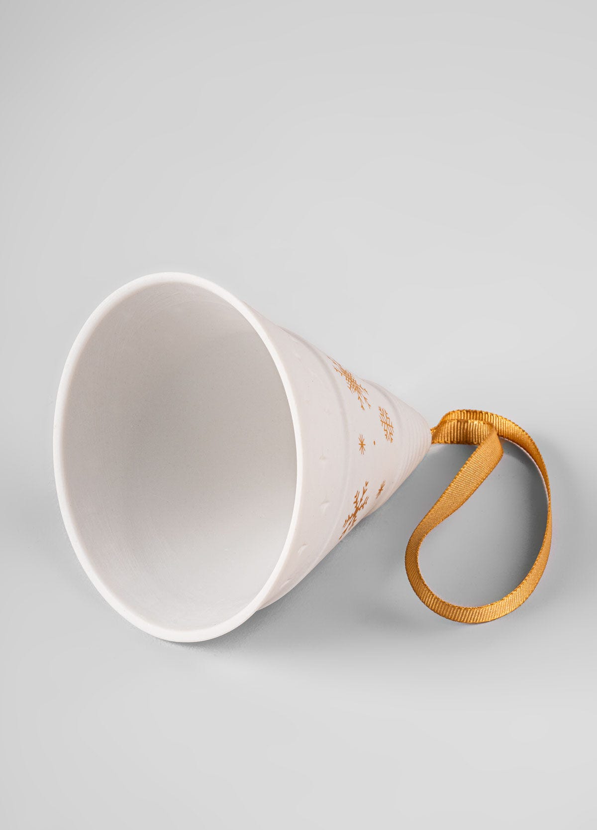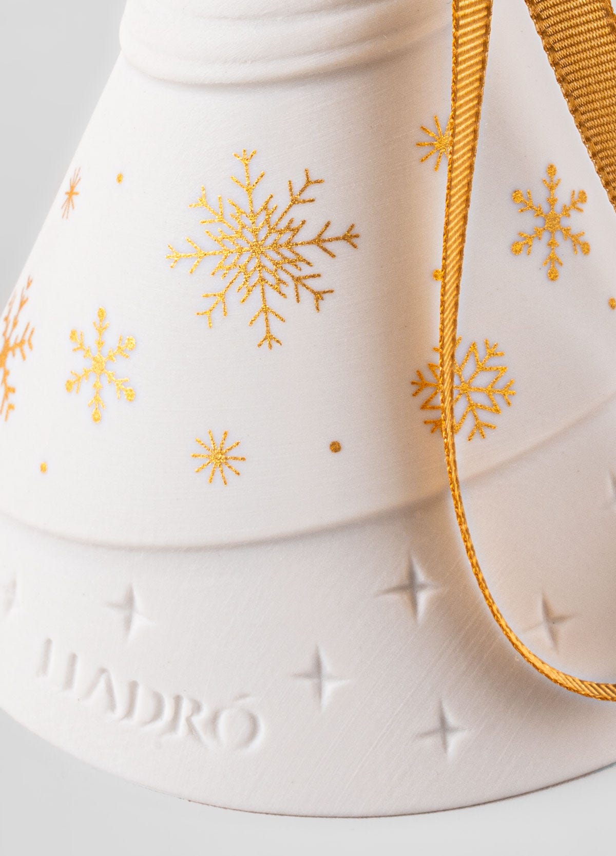 Ornamento navideño de porcelana blanca mate, decorado a mano con copos de nieve en lustre dorado y grabados de estrellas.